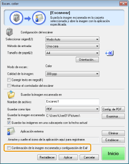 Marque la casilla de verificación [Confirmación de la imagen escaneada y configuración de Exif] (para el botón [PDF], [Confirmar la imagen escaneada]).