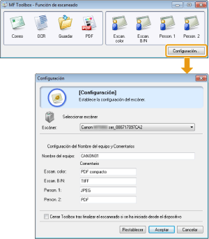 Si se marca la casilla de verificación, la pantalla de MF Toolbox se cerrará cuando haya finalizado la lectura con las teclas del panel de control.