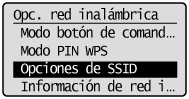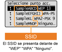 Selección del punto de accesoPara seleccionar puntos de acceso, el sistema de autenticación WEP 802.11 deberá establecerse en <Sistema abierto>, mientras el método de cifrado WPA/WPA2 habrá de configurarse en <Auto> (AES-CCMP o TKIP).