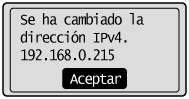 Para reiniciar la máquina cuando la opción <Obtención automática> esté establecida en <On> para la configuración de dirección IPLa Dirección IP podría cambiar cuando aparezca la siguiente pantalla. Cuando esto ocurra, configure las opciones de impresora en su ordenador utilizando esta opción. De otro modo, tal vez no pueda imprimir a la máquina desde el mismo.