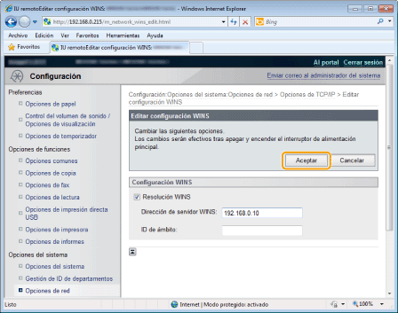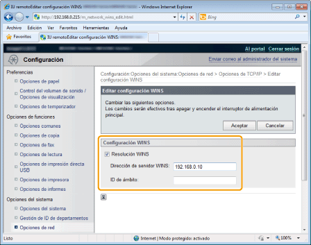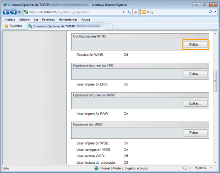 Cuando utilice la configuración de dirección IP mediante DHCPCuando obtenga una dirección IP de servidor de WINS desde el servidor de DHCP, la dirección IP obtenida desde el servidor de DHCP se sobrescribirá.