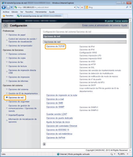 Haga clic en [Opciones de red] -> [Opciones de TCP/IP].