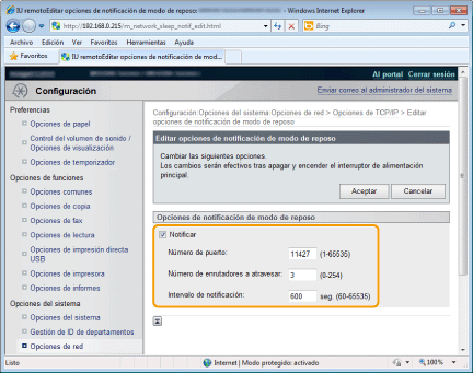 Marque la casilla de verificación para notificar a imageWARE acerca del estado energético de la máquina. Cuando seleccione [Notificar], podrá esperar beneficios como pueden ser que la máquina reduzca la comunicación innecesaria durante el modo de reposo y que se reduzca el consumo de energía total.