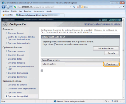 [Opciones de seguridad] -> Haga clic en [Opciones de clave y certificado] u [Opciones de certificado de CA].