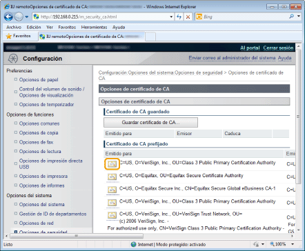 [Opciones de seguridad] -> Haga clic en [Opciones de clave y certificado] u [Opciones de certificado de CA].