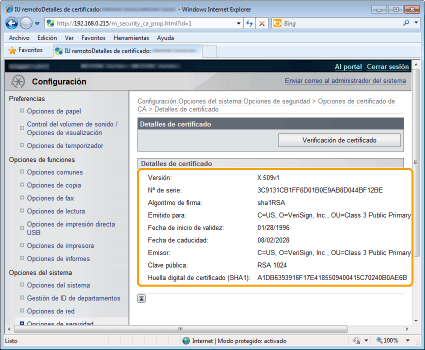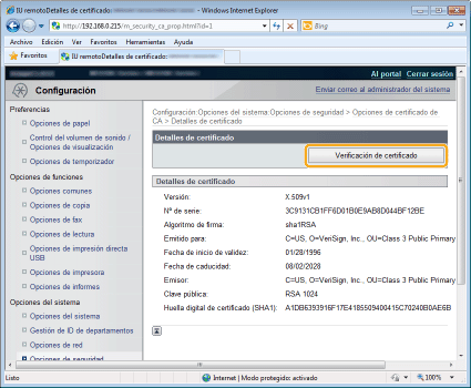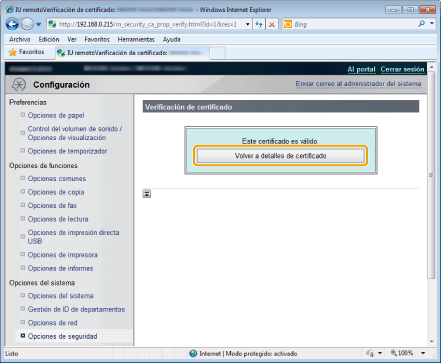 Tras comprobar el resultado de la verificación, haga clic en [Volver a detalles de certificado].