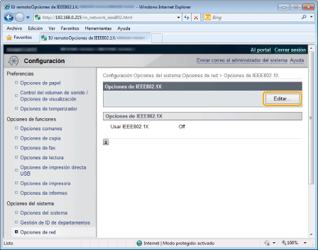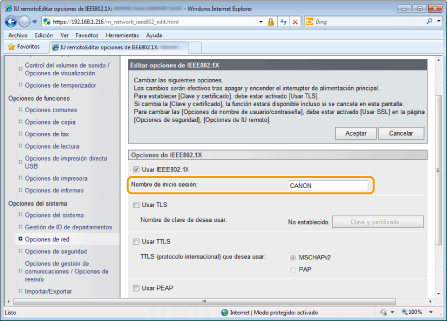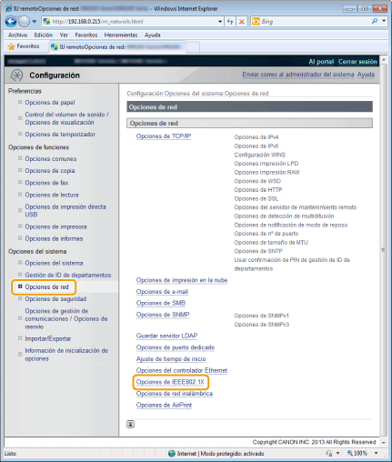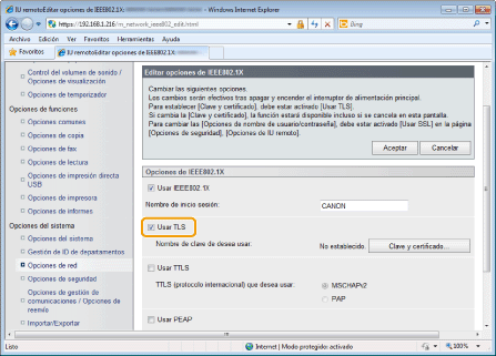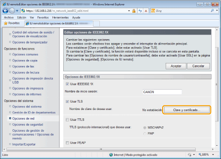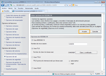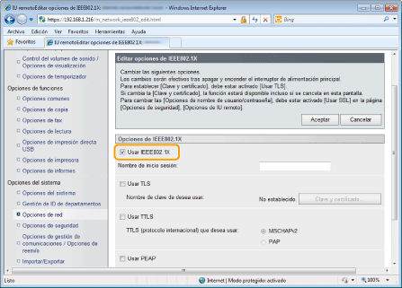 Haga clic en [Opciones de red] -> [Opciones de IEEE802.1X].