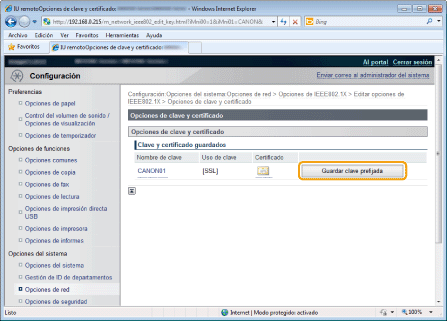 Haga clic en [Guardar clave prefijada] para especificar una clave desde una lista de claves y certificados.