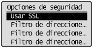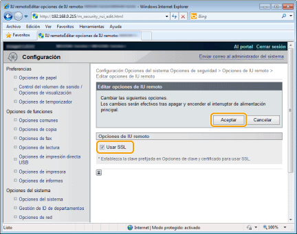 Marque la casilla de verificación [Usar SSL] y, a continuación, haga clic en [Aceptar].