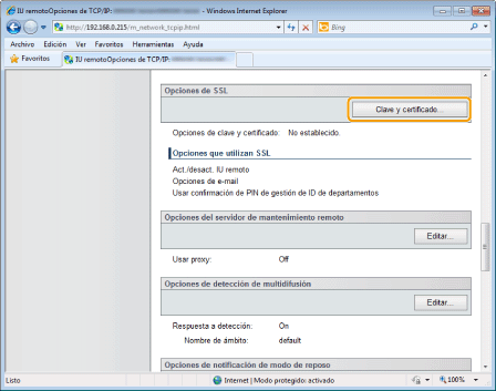 Haga clic en [Clave y certificado] bajo [Opciones de SSL].