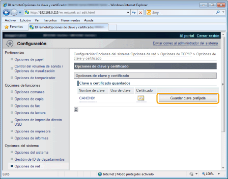 Haga clic en [Guardar clave prefijada] para especificar una clave desde una lista de claves y certificados.