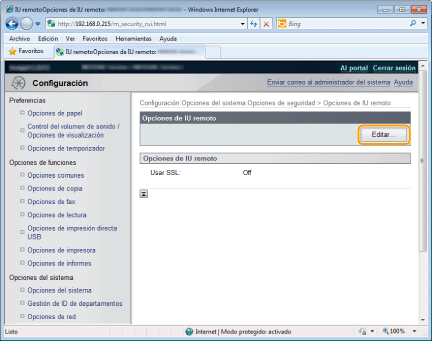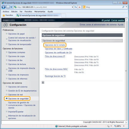 Haga clic en [Opciones de seguridad] -> [Opciones de IU remoto].