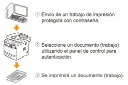 Cuando el trabajo del documento de impresión protegida con contraseña esté guardado en el dispositivoSi el documento de impresión protegida con contraseña está guardado en el dispositivo, otros trabajos de impresión podrían no imprimirse. En este caso, imprima el trabajo de impresión protegida con contraseña. Si sigue sin poder imprimir el trabajo, imprímalo de nuevo desde el ordenador.