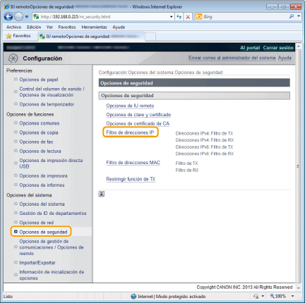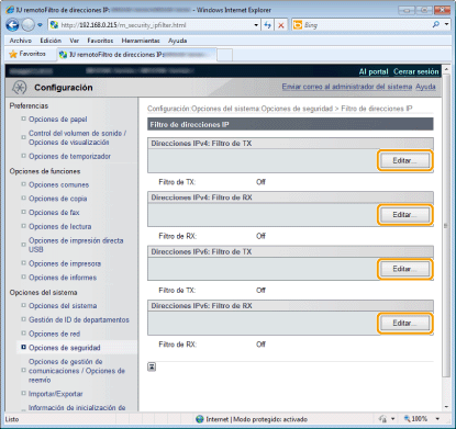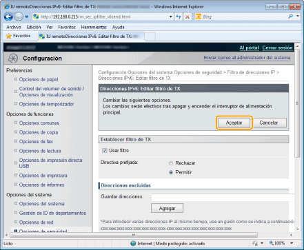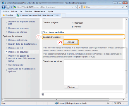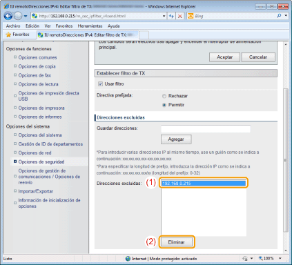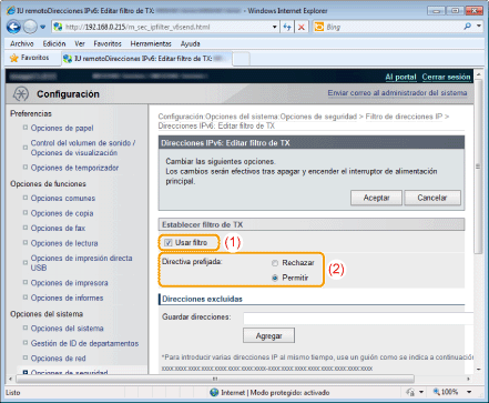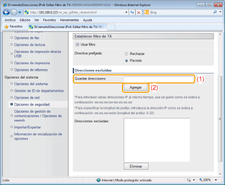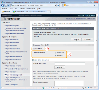 Se rechazará el acceso desde ordenadores cuyas direcciones estén especificadas en [Direcciones excluidas].