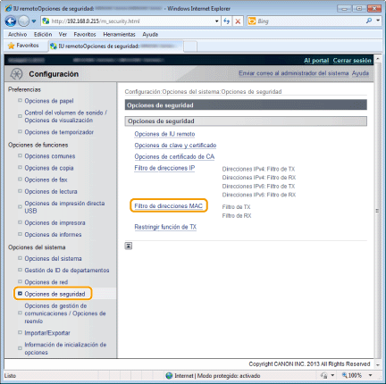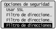 Cuando esté marcada la casilla de verificación [Usar filtro]:No podrá acceder desde las siguientes direcciones MAC. Asegúrese de introducir la dirección MAC correcta.