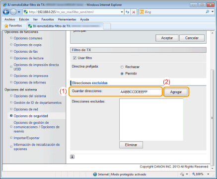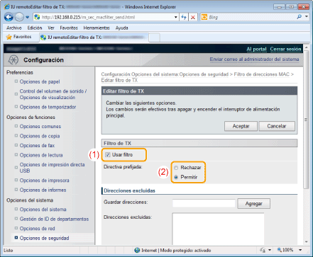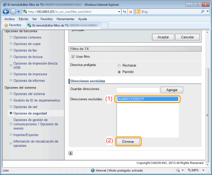 Se rechazará el acceso desde ordenadores cuyas direcciones estén especificadas en [Direcciones excluidas].