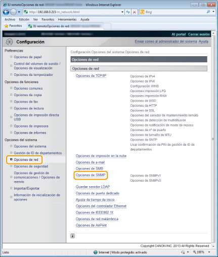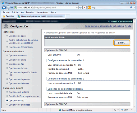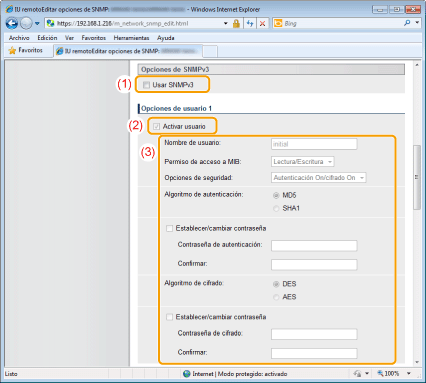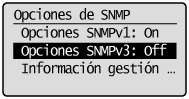 Configuración de SNMPv3<Opciones de SNMPv3> los detalles sólo podrán configurarse a través de la IU remota.