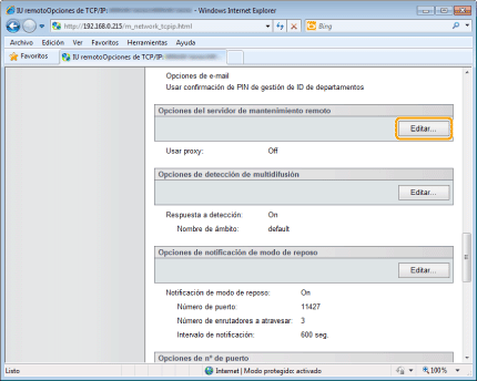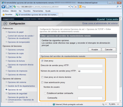 Marque la casilla de verificación para utilizar el servidor de proxy especificado para la comunicación de HTTP con la máquina.