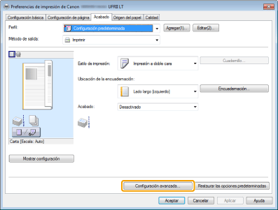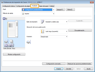 Para obtener las instrucciones acerca de cómo acceder a la pantalla del controlador de impresora, consulte "Impresión" y "Configuración de las opciones de impresión predeterminadas".