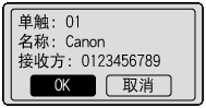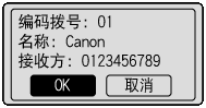 如果 <确认单触/编码拨号发送> 设置为 <打开> 而且通过单触键或编码拨号代码指定了接收方,则显示该屏幕。