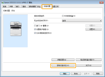 如果通过USB或WSD(设备Web服务)端口连接了打印机和计算机,将无法使用[获取设备状态]功能。需要手动配置这些设置。