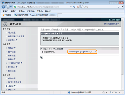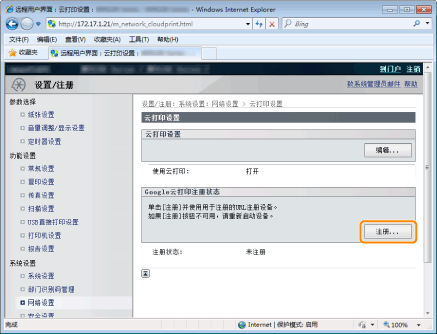 单击 [Google云打印注册状态] 中的 [注册]