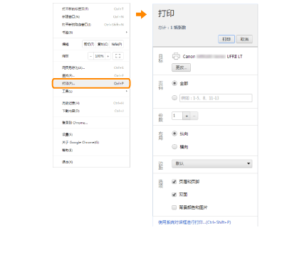从计算机或智能手机等移动设备上支持 Google Cloud Print 的应用程序(如 Google Chrome™、Gmail 或 Google Docs)显示打印屏幕。下面显示的屏幕为在计算机上从 Google Chrome 打印文档时的例子。各应用程序的打印屏幕有所不同。