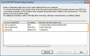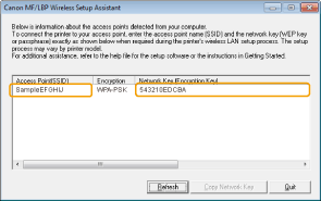 如果 SSID 和网络密钥没有在无线 LAN 路由器或接入点的主体上显示或者由于其已更改而导致您不确定,则可以使用 Canon MF/LBP 无线设置助手进行检查。