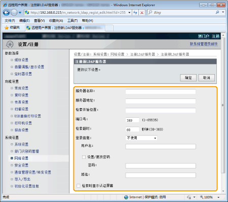 如果网络中实施了 LDAP 服务器,则可以将传真号码和电子邮件地址注册到该服务器,以便可以搜索它们并将其指定为传真或电子邮件接收方,或将它们复制到地址簿。可以将最多五个 LDAP 服务器注册到本机。