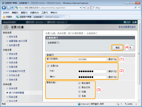 ![]() 对于不限制该功能的部门,可以选择 <是>,然后输入其部门识别码和 PIN 以使用本产品。