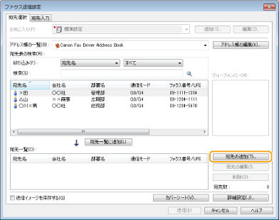 ![]() ![]() [宛先入力]タブで入力できる宛先は1件のみです。一度に複数の宛先にファクス送信する場合には、[宛先選択]タブを使用してください。