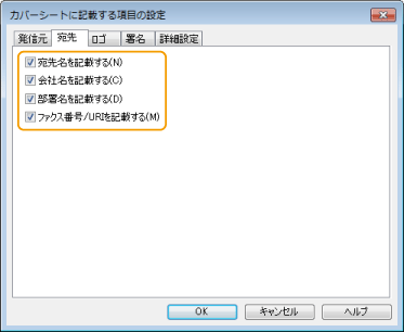 宛先情報として必要な項目にチェックマークを付け、内容を入力します。宛先名、会社名、部署名、ファクス番号は[宛先選択]/[宛先入力]タブで入力した内容(