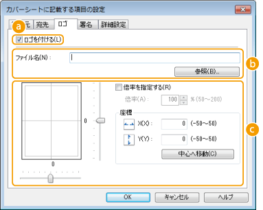 カバーシートにロゴまたは署名を付ける場合は、[ロゴを付ける]または[署名を付ける]にチェックマークを付けます。あらかじめロゴや署名として使うビットマップ形式のデータを用意しておく必要があります。