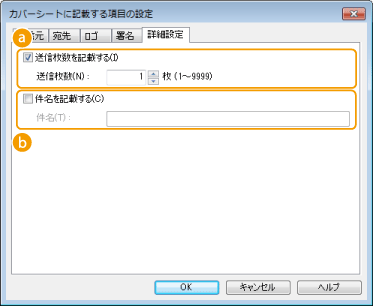 カバーシートに送信枚数を記載したい場合はチェックマークを付け、送信枚数を[送信枚数]に入力します。送信枚数は自動で計算されません。ここで入力した値がカバーシートに記載されます。