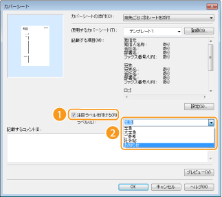 「至急」、「社外秘」などのマークをカバーシートに記載できます。リストから選ぶ代わりに、任意の文字を[ラベル]に直接入力することもできます。