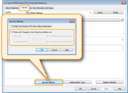 If you have selected [Protect with Password when Exporting Address List] in the dialog box that is displayed when [Security Settings] of the [Special] tab is clicked, a dialog box for entering a password is displayed when you click [Export]. For more information, click [Help] on the fax driver screen.