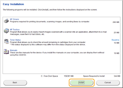 You can choose to install standard software and the e-Manual with [Easy Installation], or specify the software and manuals to install with [Custom Installation].