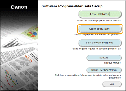 If you do not want to install the e-Manual on your computer or want to customize installed software, click [Custom Installation].