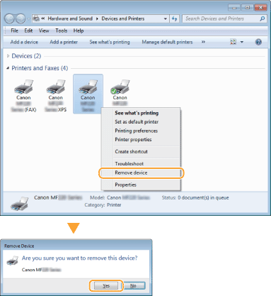 Deleting unneeded printer iconsWhen you have finished installing the network printer, the icon added in step 13 of Installing the MF Drivers is no longer needed. To delete the icon, right-click it and select [Remove device] or [Delete]  click [Yes]. |