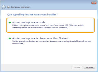 Si vous utilisez Windows Vista/7/8/Server 2008/Server 2008 R2/Server 2012/Server 2012 R2, vous pouvez imprimer à l'aide du protocole WSD (Web Services on Devices). Si vous souhaitez utiliser le protocole WSD, commencez par installer le pilote d'imprimante, puis ajoutez une imprimante réseau.
