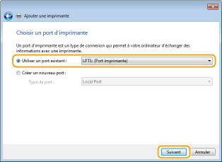 Vérifiez que [LPT1] est sélectionné sous [Utiliser un port existant], et cliquez sur [Suivant].