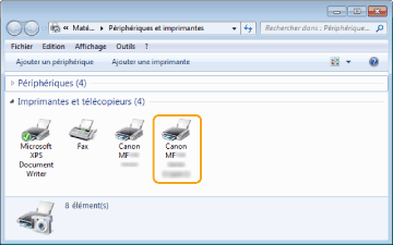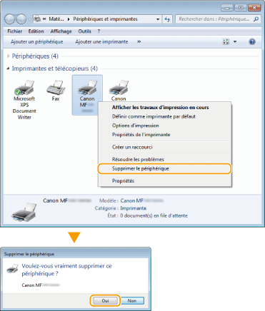 Suppression des icônes d'imprimantes inutilesLorsque l'installation de l'imprimante réseau est terminée, l'icône ajoutée à l'étape 13 de Installation des pilotes MF n'est plus nécessaire. Pour la supprimer, cliquez dessus avec le bouton droit et sélectionnez [Supprimer le périphérique] ou [Supprimer]  cliquez sur [Oui]. |