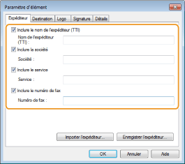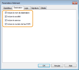 Sélectionnez les éléments relatifs au destinataire que vous voulez inclure et renseignez les informations. Le nom des destinataires, des entreprises, des services et les numéros de fax indiqués dans l'onglet [Sélectionner la destination]/[Saisir la destination] (