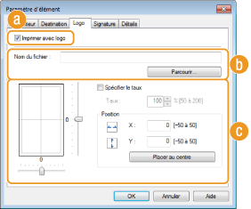 Ajustez la dimension et la position des logos ou signatures spécifiés en observant l'image figurant à gauche.