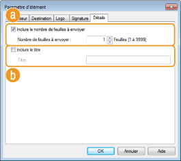 Cochez cette case si vous désirez indiquer, sur la page de garde, le nombre de feuilles que vous êtes sur le point d'envoyer et précisez-en le nombre dans [Nombre de feuilles à envoyer]. Le nombre de feuilles à envoyer n'est pas comptabilisé automatiquement. La valeur que vous indiquez dans ce champ est reportée dans la page de garde.