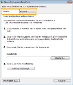 Address Book Import/Export Tool deve essere utilizzato quando macchina e computer sono collegati via cavo USB.
