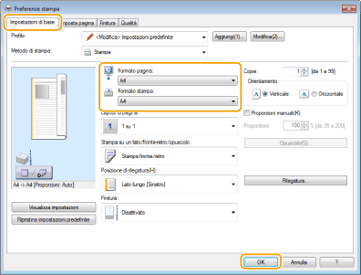 Scheda [Impostazioni di base] Selezionare il formato del documento in [Formato pagina] Selezionare il formato del foglio in [Formato stampa] [OK]