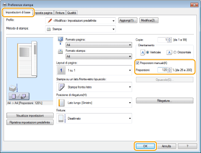 Scheda [Impostazioni di base] Selezionare la casella di controllo [Proporzioni manuali] Specificare il rapporto di stampa in [Proporzioni] [OK]