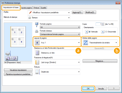 È possibile stampare più pagine su un singolo foglio. Ad esempio, è possibile stampare da quattro a nove pagine su un foglio con l'opzione [4 su 1] o [9 su 1]. Utilizzare questa funzione per risparmiare carta o visualizzare il documento come miniatura.