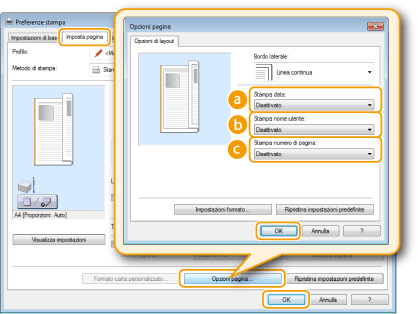 Scheda [Imposta pagina] Fare clic su [Opzioni pagina] Selezionare la posizione di stampa della data di stampa, del nome utente o del numero di pagina [OK]  [OK]